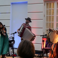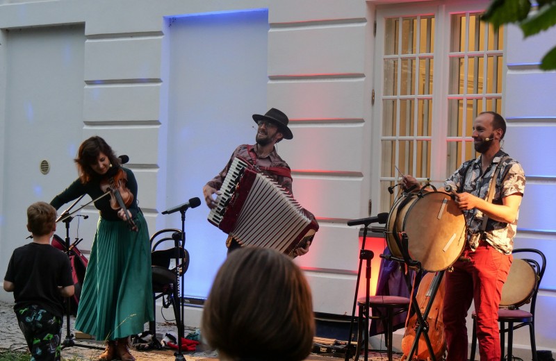trzy osoby słuchają grającej skrzypaczki i perkusistki