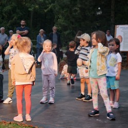 Pianista i wokalistka podczas koncertu, dzieci siedzące pod pianinem