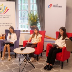 Siedząca pani z mikrofonem w ręku