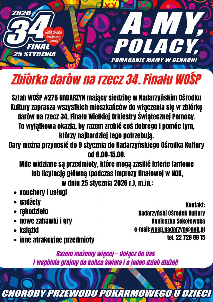 Sztab WOŚP #275 NADARZYN mający siedzibę w Nadarzyńskim Ośrodku Kultury zaprasza wszystkich mieszkańców do włączenia się w zbiórkę darów na rzecz 34. Finału Wielkiej Orkiestry Świątecznej Pomocy. To wyjątkowa okazja, by razem zrobić coś dobrego i pomóc tym, którzy najbardziej tego potrzebują.