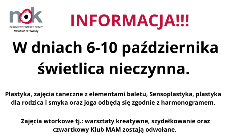 W dniach 6-10 października świetlica nieczynna. Plastyka, zajęcia taneczne z elementami baletu, Sensoplastyka, plastyka dla rodzica i smyka oraz joga odbędą się zgodnie z harmonogramem. Zajęcia wtorkowe tj.: warsztaty kreatywne, szydełkowanie oraz czwartkowy Klub MAM zostają odwołane.