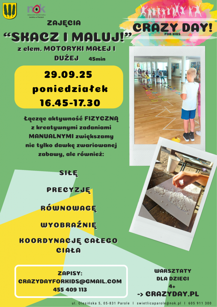 Zajęcia “Skacz i Maluj” z elementami motoryki małej i dużej. Warsztaty dla dzieci 4+ 29.09.25 poniedziałek, godz. 16.45-17.30 czas trwania 45 min. Koszt: 45zł Zapisy: crazydayforkids@gmail.com lub tel. 455 409 113